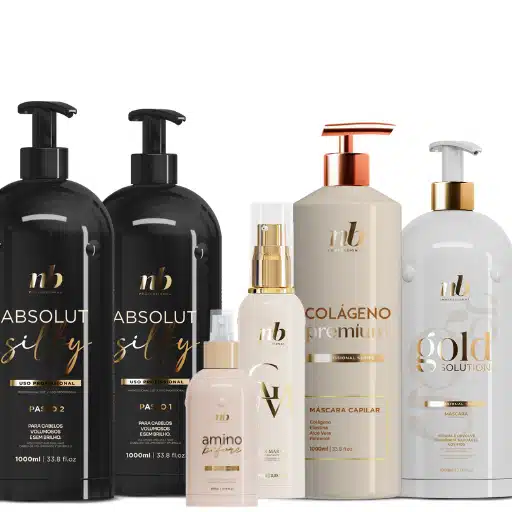 Il kit comprende Shampoo e Trattamento Absolute Silky, Amino Before, Golden Marrocos e Maschere Gold Solution/Collageno per un effetto liscio naturale e duraturo.